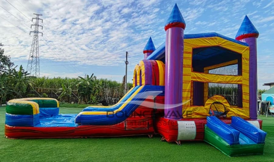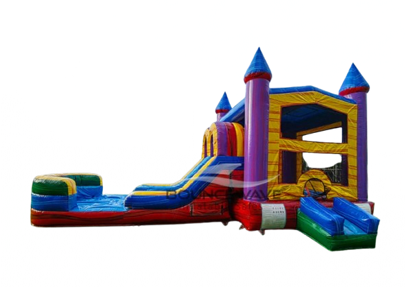Upgrade any party with the Marble Dual Lane Bounce House Slide rental. This double lane combo offers wet and dry fun. It features a bright multi-color design and an inflated splash pad for hours of excitement. Perfect for kids’ parties, school events, and backyard celebrations.